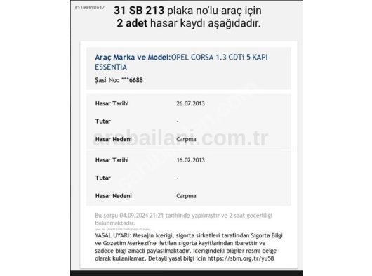 2013 yılında 2 adet hasar kaydı vardır, ayrıntılar son fotoğraftadır.